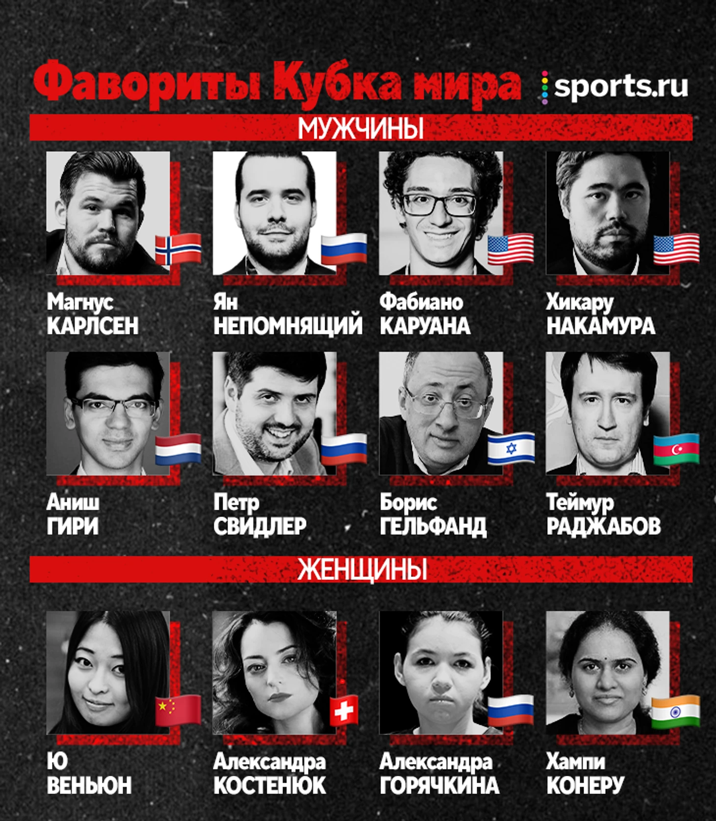 Россиян среди участников Кубка мира много. Большая часть из них будет играть в нейтральном статусе под флагом FIDE – это Непомнящий, Александр Грищук, Петр Свидлер, Андрей Есипенко, Даниил Дубов и другие. Приехали в Баку под новым флагом и те, кто недавно сменил гражданство – Владимир Федосеев и Антон Демченко впервые сыграют за Словению, Александра Костенюк – за Швейцарию.