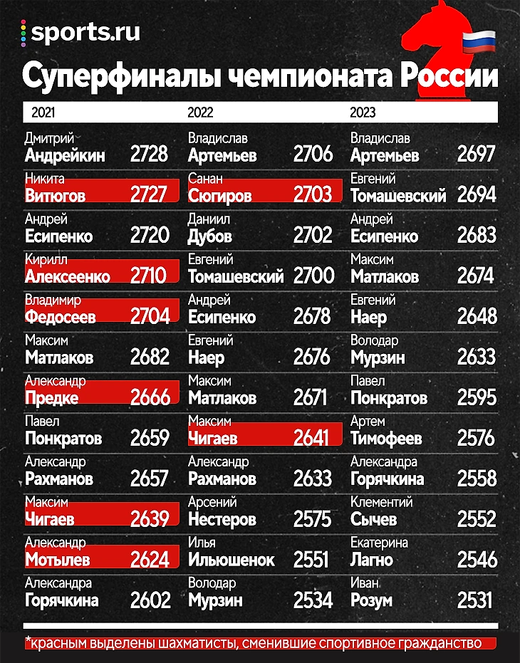 Все наглядно. Из 12 участников суперфинала чемпионата России-2021 за последние полтора года уехали и сменили спортивное гражданство шестеро, ровно половина. Хотя исполнительный директор ФШР Александр Ткачев по-прежнему не теряет оптимизма.