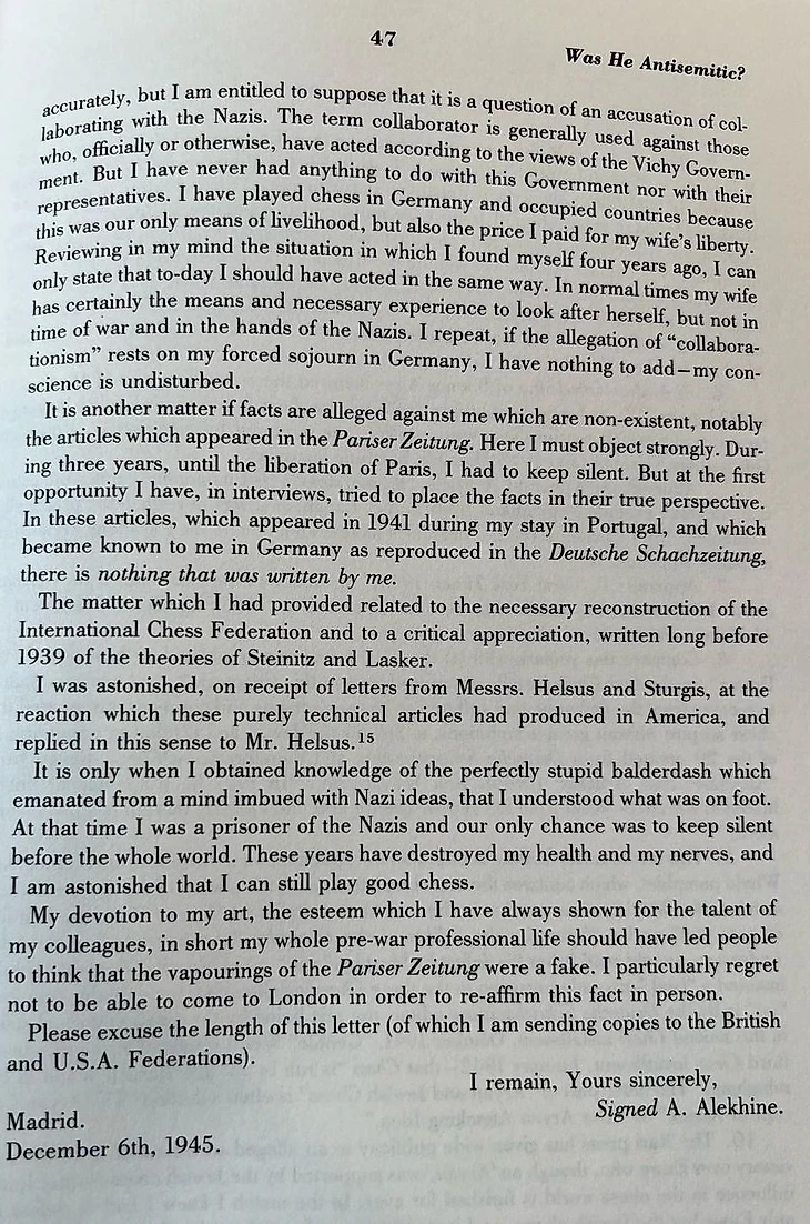 «...Во Франции за своё сотрудничество с оккупационными войсками чемпион мира Александр Алёхин подвергся суровой обструкции, заставившей его в конце 1945 года бежать в португальский рыбацкий посёлок Эшторил, где 24 марта 1946 года он внезапно скончался. (По поводу внезапной смерти Александра Алёхина существует несколько версий, в том числе версия о его насильственной смерти, о чём рассказывается в эпилоге данной статьи — Б. С.).»