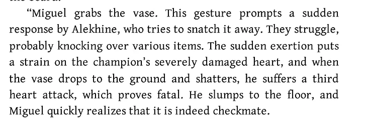 Новое поколение зумеров (зачёркнуто) игроков, после того, как эта книга будет, допустим, экранизирована, ведь немедленно станет считать такую версию смерти Алехина основной, не правда ли?