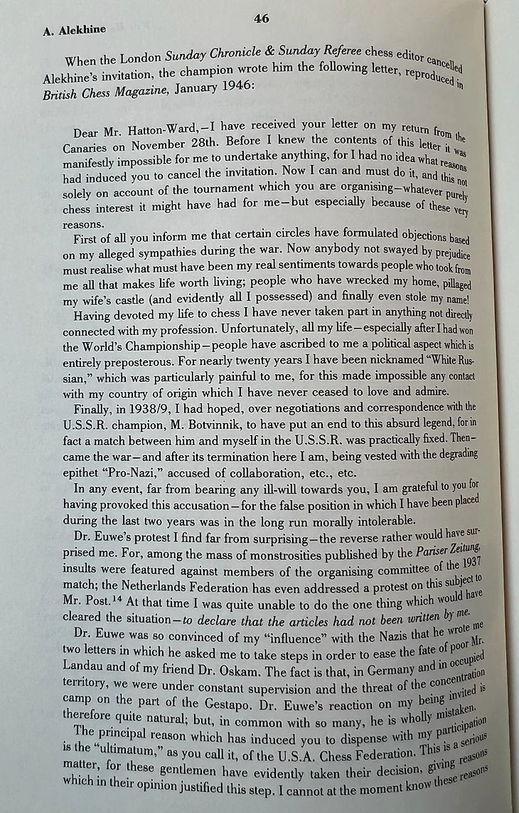 За организацией послевоенного бойкота Алехина, упомянутого в начале статьи, стояли шахфед Нидерландов с Максом Эйве и шахфед США с Арнольдом Денкером. Об этих персонах и этих федерациях мы можем говорить уверенно. Про Эйве рассуждает сам Алехин в письме организатору Лондонского турнира Уолтеру Хаттон-Уорду (Walter Hatton-Ward) 6 декабря 1945 года: