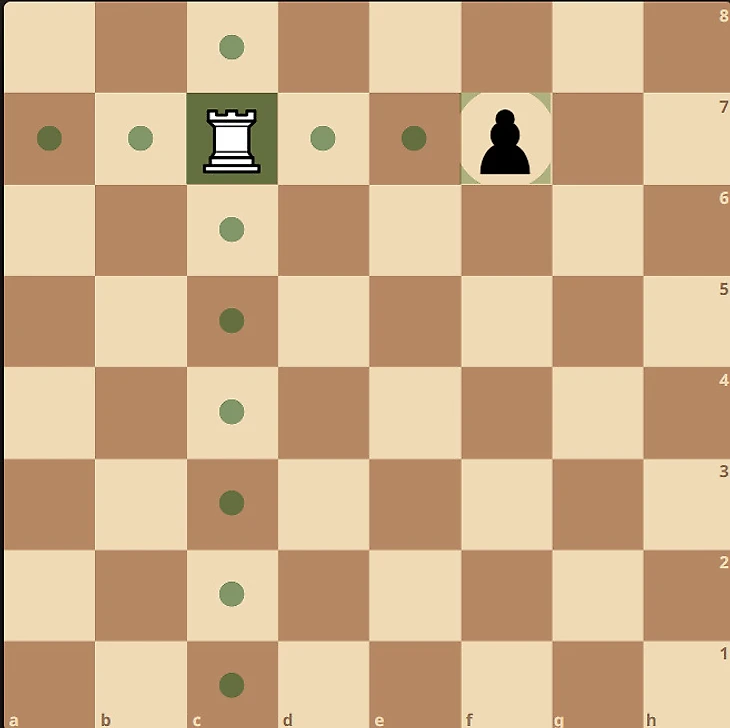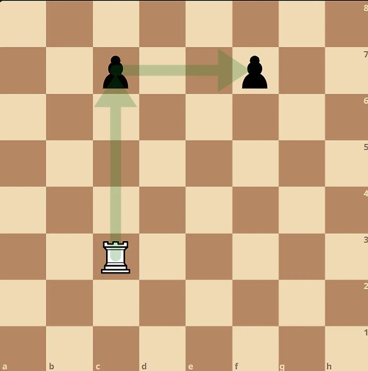 Ладья ходит по горизонтали и вертикали, так же она и бьет фигуры соперника. Обратите внимание на рисунок по вертикали сначала белая ладья может взять пешку черных на c7, а затем вторую пешку черных на f7. В каждом из случаев ладья занимает место черных пешек. Следует помнить, что за один ход ладья может забрать только одну фигуру соперника.