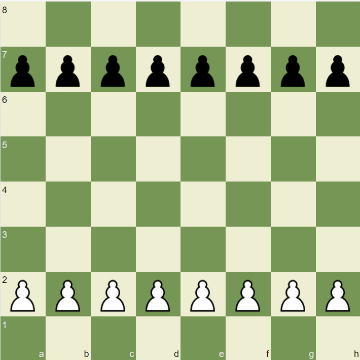Прежде всего пешек большинство на шахматной доске, они солдаты. Как любой солдат в бою они могут взять в плен, в нашем случае срубить важную фигуру, но и сами являются наиболее уязвимыми. Ходят пешки только вперед, им нельзя отступать. Если рубят, то только по диагонали. Каждая из фигур соперника может подойти к пешке вплотную, но вот оказаться по диагонали от нее никак нельзя, поскольку тут же попадаешь под удар. Пусть пешки уязвимы, зато у них есть качество, которым не обладает ни одна другая фигура. Они могут превращаться в любую из них. Как это происходит, показываем на примерах. Расставляем пешки на доске и обращаем внимание, что белые всегда располагаются на втором поле, а черные на седьмом.