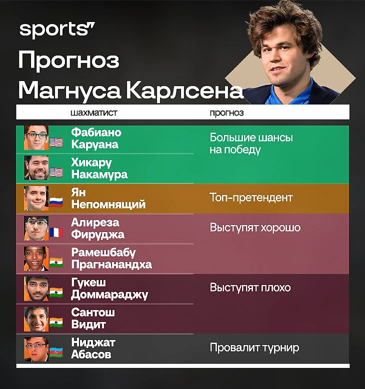 Экс-чемпион мира Магнус Карлсен отобрался на турнир, но отказался в нем участвовать и сморит на соревнования со стороны. Перед турниром он оценил всех участников и распределил по шкале от того, у кого меньше всего шансов на победу, до главного фаворита.