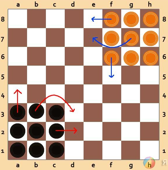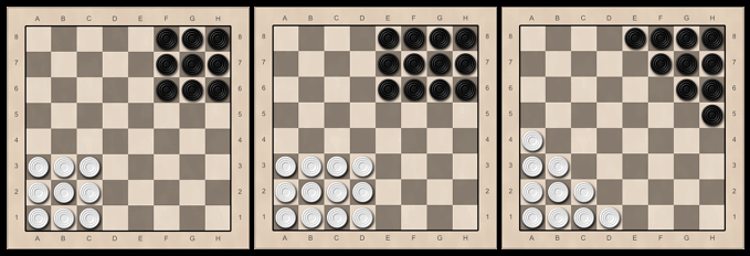 Как и в шахматах, здесь игру начинают белые. Шашка передвигается на одну в поле вперед, прямо или в сторону. Далее ходит игрок с черными фишками.