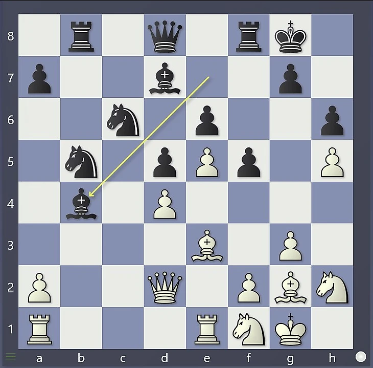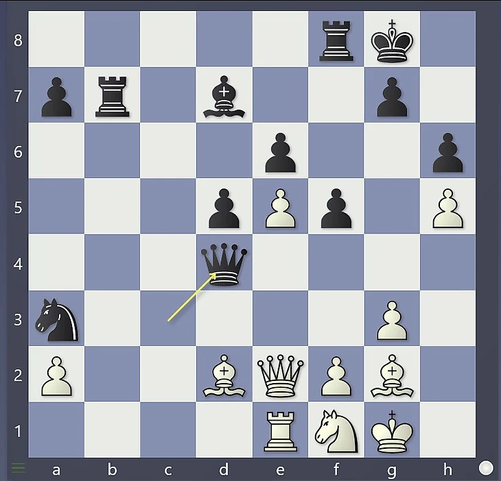 Ошибка, чуть не выпустившая перевес черных. Можно было спокойно отойти ферзем, например на b2