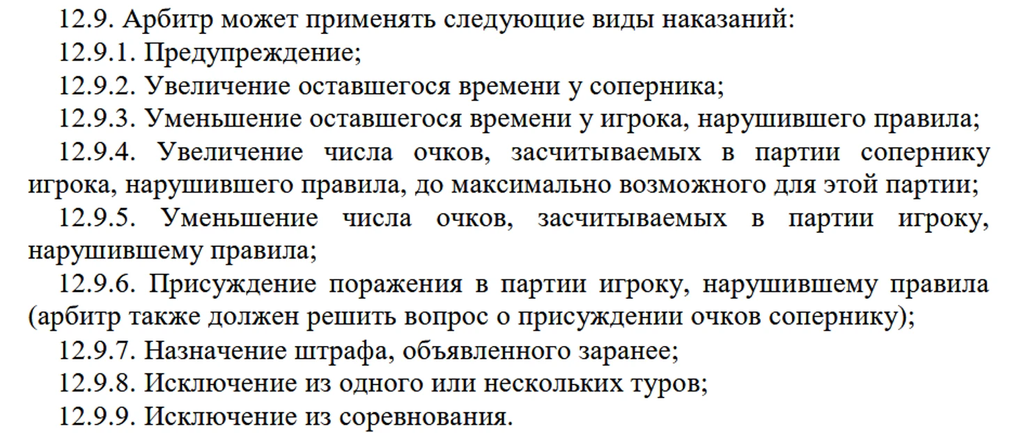 А разница на самом деле есть. Потому что если рассматривать «рокировку» ферзем как два хода подряд, то дополнительное время добавлять игроку, чей соперник нарушил правила, не обязаны. При нарушении статей 1.2 и 1.3, а в данном случае нарушаются именно они, игрок наказывается по любимой статье шахматных арбитров — статье 12.9.