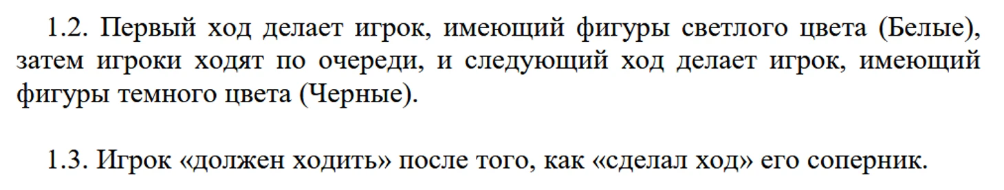 Давайте попробуем копнуть чуть глубже и обратимся к букве закона шахмат. В шахматах игроки делают ходы по очереди. Об этом нам говорят одни из первых статей правил шахмат — статьи 1.2 и 1.3.