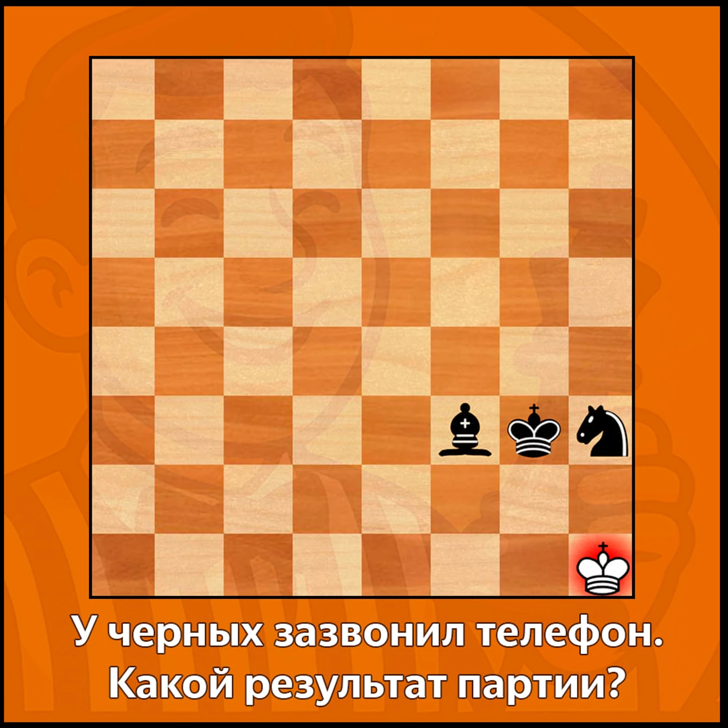 Довольно легко принять решение в позиции на диаграмме. У черных зазвонил телефон, но у белых голый король. Какой результат партии?
