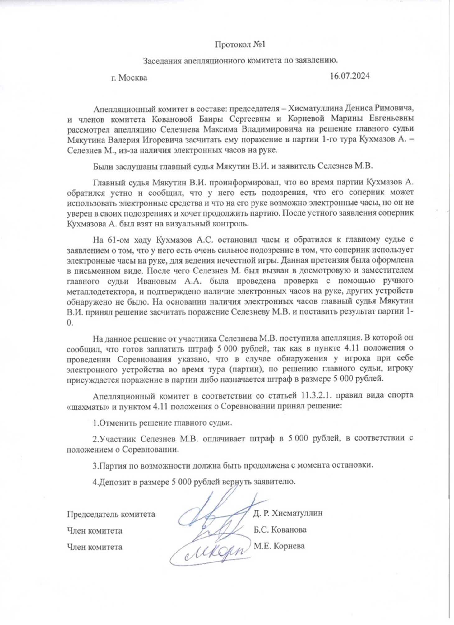 Апелляционный комитет отменил решение судьи, наложил штраф на игрока и принял решение о возобновлении партии. Кухмазову присуждено поражение, вероятно из-за отсутствия на месте.