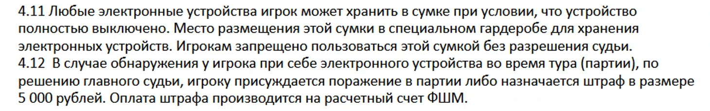 Нужно помнить и учитывать, что телефон и тому подобное — это противоправное влияние на результат, что не допускается и наказывается в соответствии с правилами вида спорта «шахматы» (Раздел I «Общие положения», Статья 6 «Противоправное влияние на результаты соревнований по виду спорта «шахматы» и санкции, применяемые к участникам соревнований и другим официальным лицам соревнований за противоправное влияние на результаты таких соревнований).