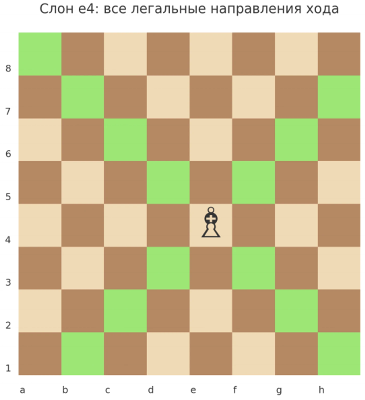 Позиция: белый слон на e4, вокруг нет фигур. Доступны клетки:f5, g6, h7; d5, c6, b7, a8; f3, g2, h1; d3, c2, b1. Контраст к «заблокированной» версии: при преградах собственными пешками число доступных ходов может сокращаться с ~13 до 5 и меньше.