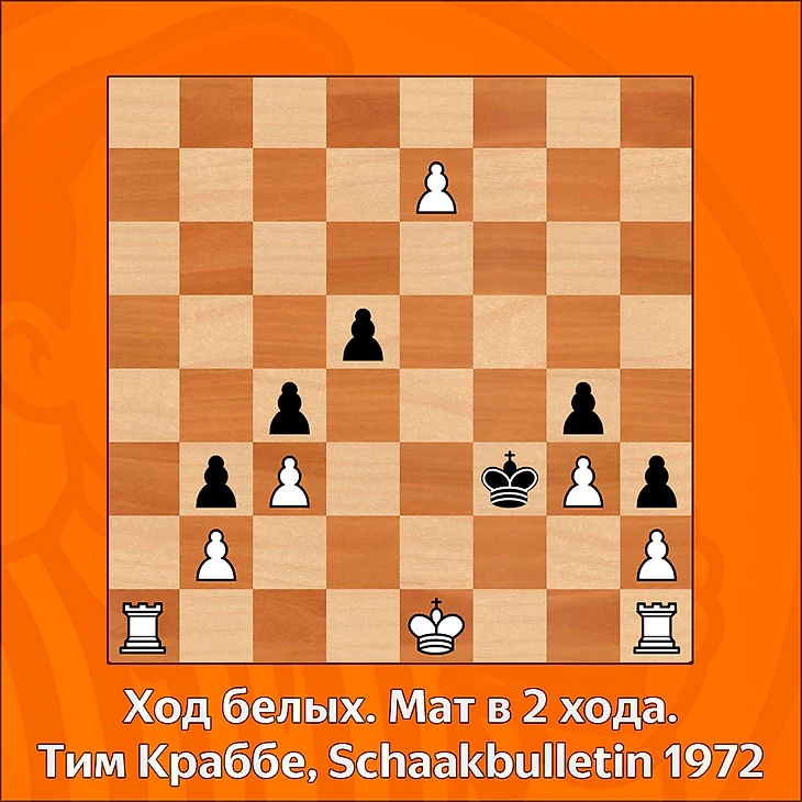 Это задача-шутка. Решение крайне необычное. Если не знать ответ, то решить невозможно. Первым ходом белые проводят пешку и превращают ее в ладью! Черные делают единственный ход — 1..Крc2. Вопрос, как поставить мат в 1 ход? И тут следует убийственное — 2.0-0-0-0-0-0#. Белые делают рокировку с не ходившей ладьёй, которая только что появилась из пешки.