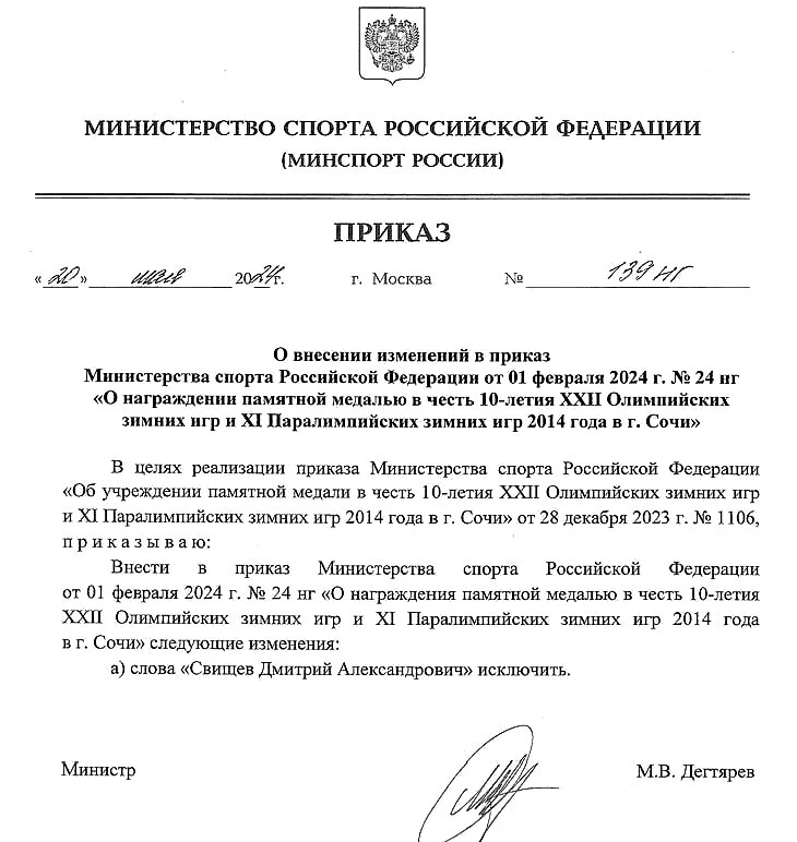 Обычный наградной приказ чиновника (в 2014-м Свищев возглавлял федерацию керлинга России, которая, правда, в Сочи-2014 осталась без пьедестала) медалью, которую Минспорт учредил в декабре 2023-го для вручения «работникам в области физической культуры и спорта, государственным гражданским служащим, муниципальным служащим, должностным лицам органов государственной власти Российской Федерации, органов государственной власти субъектов Российской Федерации, органов местного самоуправления, общественным и государственным деятелям, а также иным лицам и организациям, внесшим значительный вклад в подготовку и проведение Игр».