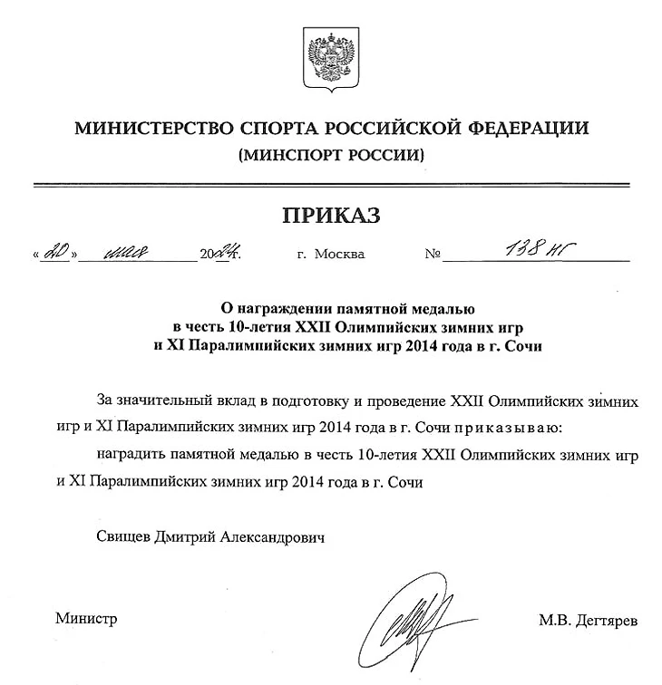 наградить памятной медалью в честь 10-летия XXII Олимпийских зимних игр и XI Паралимпийских зимних игр 2014 года в г. Сочи Свищева Дмитрия Александровича».