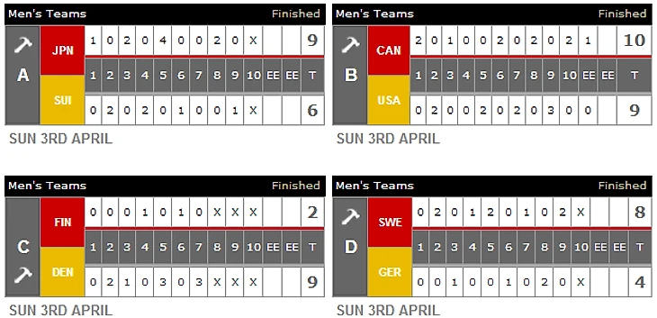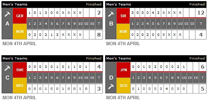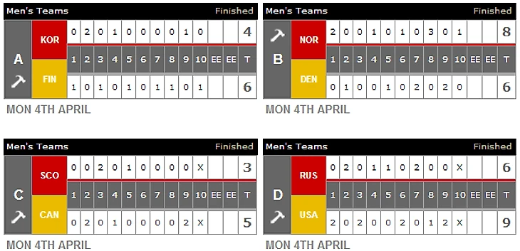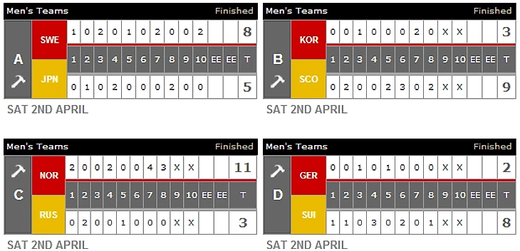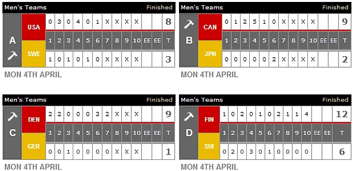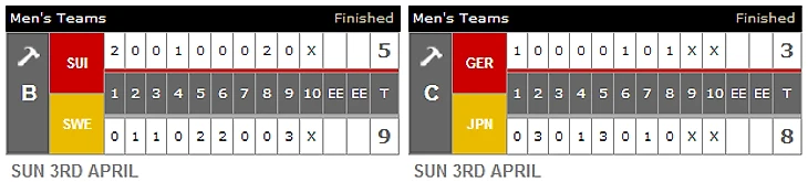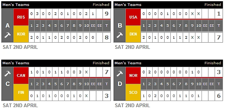Сразу три игры завершились досрочно. Это бы явно не день Эдина, если в игре с нашими он с трудом спасся, но Шустер шансов ему не оставил, сделав замечательный бросок в четвертом энде, например.