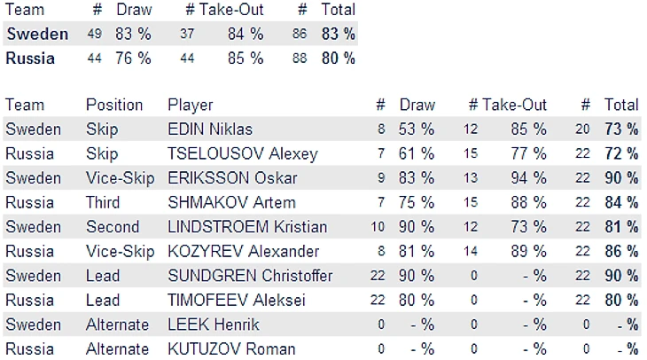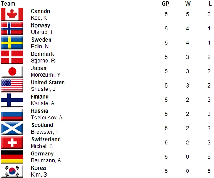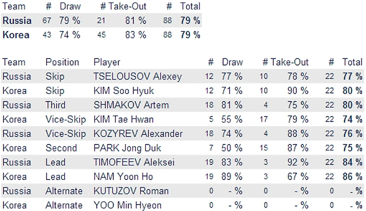 Очень плохо играют тут немцы, особенно их скип, у которого по итогам пяти игр в среднем только 66%. Для сравнения: у корейского скипа, который тоже пять игр проиграл, 76%.