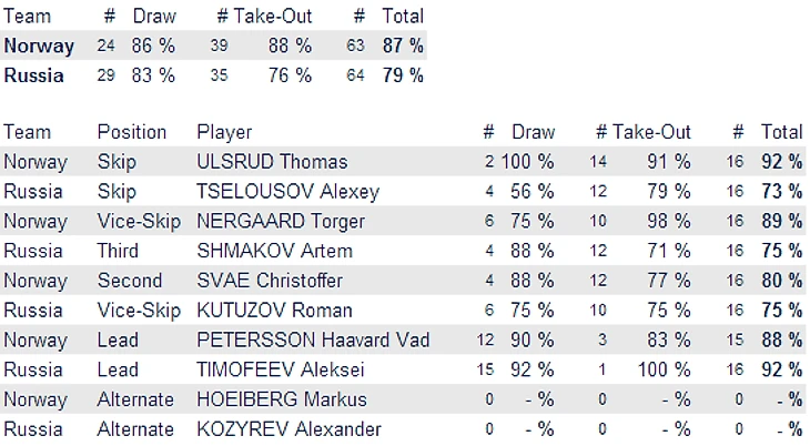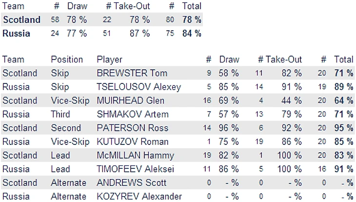Шотландцы с канадцами сыграли отличную игру, и у тех, и у других командный процент 90. Но на позициях скипа и третьего номера небольшой перевес был именно у Канады.