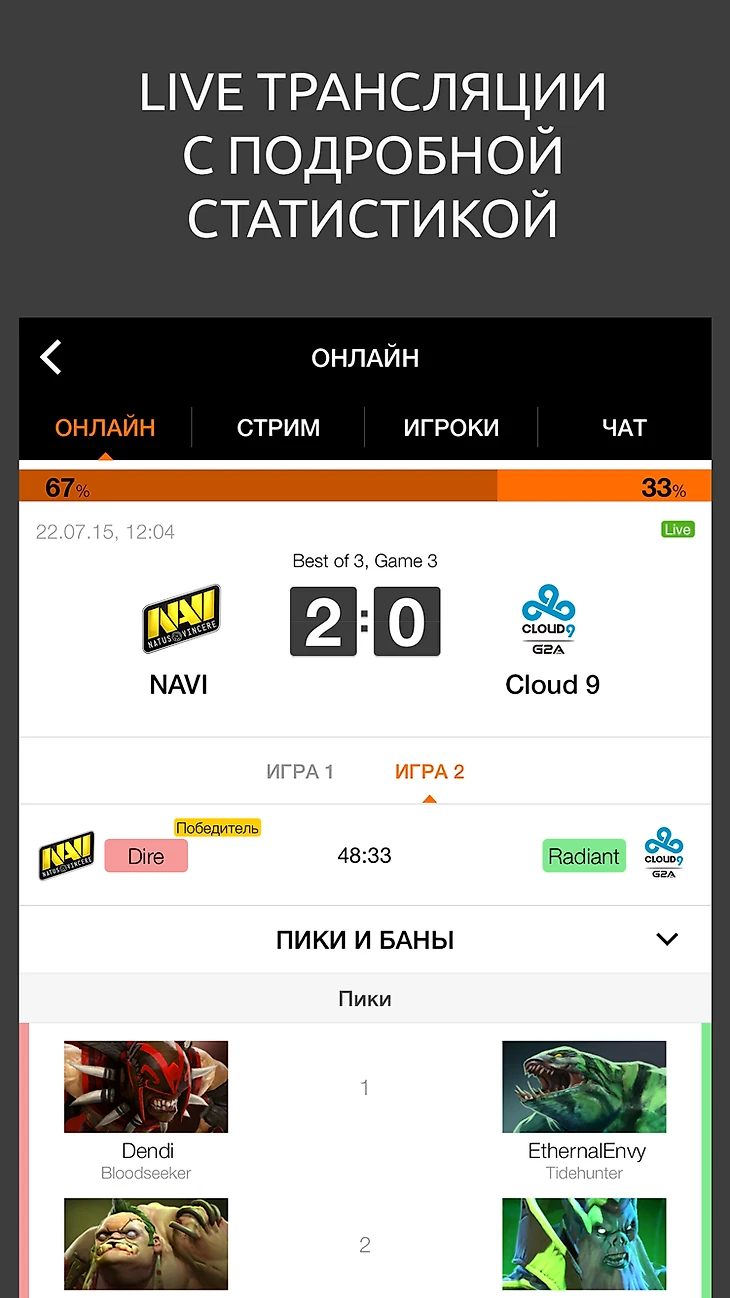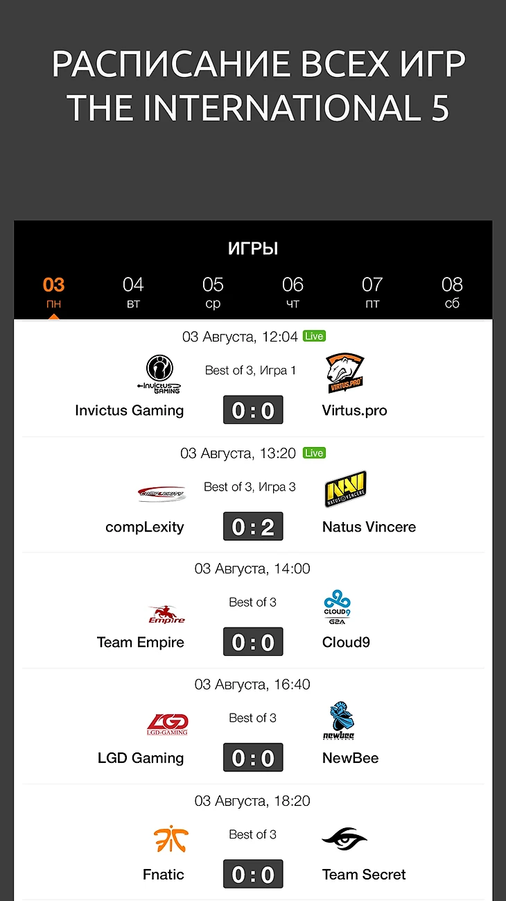 • Live-трансляции всех матчей The International 5 с подробной статистикой;