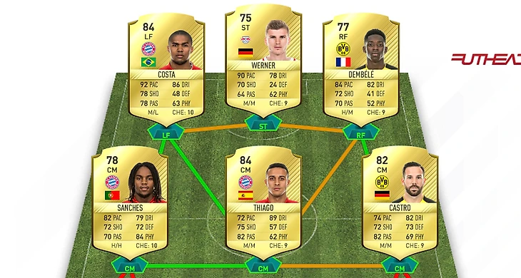 далее перейдем к нападению, тут слева я вижу только Costa имеющего 5 звездочек на финтах и играющего просто божественно, справа все чуть сложнее, лично мое предпочтение это Dembele у которого 4 звезды на финтах и 5 на слабой ноге, так же можно попробовать Bellarabi или Embolo
