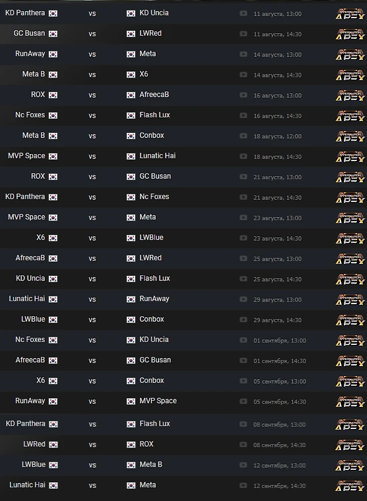 Сборная Южной Кореи вальяжно прошлась по групповому этапу, взяв 15 карт из 15, и игроки вернулись в расположения своих команд. Ryujehong, tobi и zunba вернулись в состав действующего чемпиона - команды "Lunatic-Hai". Fl0w3R и Saebyeolbe в "LW Blue", а Mano в состав бронзовых призеров "APEX" - "AF.Blue" (Afreeca Freecs). На этот раз организаторы решили не приглашать некорейские команды, как это было ранее с "EnVyUs" и "Rogue". В связи с этим немного изменена система розыгрыша. "APEX" этого сезона, подразумевает несколько групповых этапов. На первом этапе будет 4 группы по 4 команды. В каждой группе 2 лучших коллектива проходят в следующий групповой этап. Третьи команды покидают турнир до следующего розыгрыша. Четвертые вылетают в турнир рангом ниже, в котором и разыгрывают право сыграть на основном "APEX" следующего сезона. Второй групповой этап состоит из 2 групп по 4 команды, из каждой группы две лучшие проходят в полуфиналы плей-офф. На групповых этапах матч идет до трех побед, в плей-офф - до четырех.