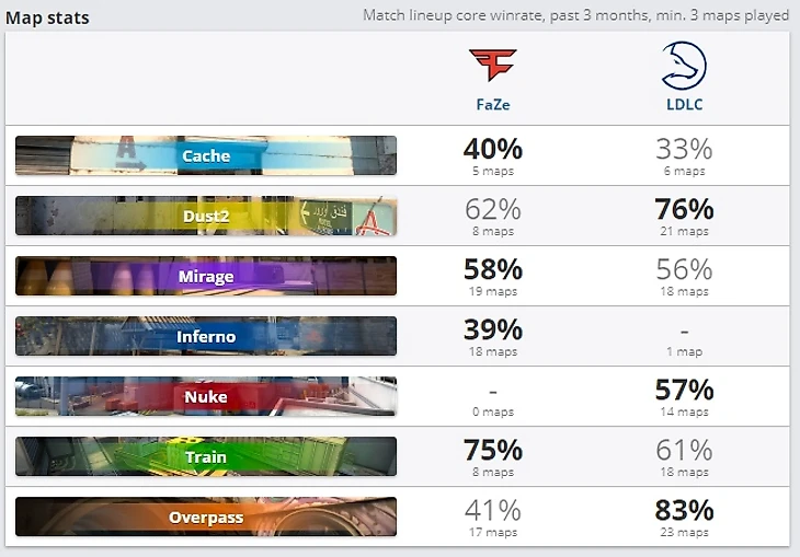 В связи с неясной ситуацией по керригану думаю возможны проблемы по морали и прочему у Faze. LDLC не тир-1 команда, но и не глупцы и если выйдут на overpass/train, то могут побороться за свою плюсовую фору, на других картах будут проблемы.