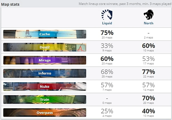 Думаю North буду избегать карты cache, а вот остальные в целом на уровне и могут играться. Из желаемых по существу останется inferno/mirage а остальные будут убирать Liquid и совсем малый шанс на карту nuke.