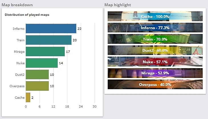 Статистика даже больше кривая, ведь матчи ECS и ESL часто закидывали или команда не играла на всю силу. По итогу всё равно имеем в топе 3 карты: inferno/cache/mirage и будут стараться выходить на эти же карты. С другой стороны точно буду избавляться от карты train и overpass, поэтому могут быть проблемы.