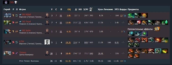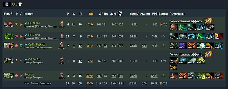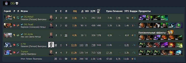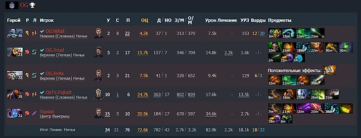 Вторая карта гораздо интереснее. Она была дольше и, кажется, далась OG несколько сложнее. Система проявила себя именно тогда, когда это было нужнее всего: Пайкатт имеет скромный нетворс на уровне оффлейнера, он только третий по урону по героям - зато он меньше всех на карте умирает и выдает больше лечения, чем вся команда соперников. Вот как надо подносить снаряды! Немаловажно, что этот матч OG выиграли против Фантомки, которая проигрывает сейчас очень редко.
