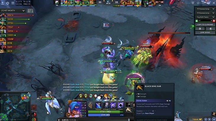 1 ая карта матча между Team Secret и Forward Gaming за верхнюю сетку. Драка на 23й минуте, которая решила судьбу карты, а возможно и всего противостояния. Forward Gaming к этому моменту ведут около 2х тысяч, имеют 3 из 4х топовых нетворса на карте, забирают Рошана, а вражеский Anti-Mage тем временем потягивает эль в таверне. Что может пойти не так? Небрежная игра от Resolut1on, который не выложил Magic Wand заранее позволяет MidOne заденаить aegis фамильяром, а сворованный заранее Hoof Stomp по четверым оставшимся героям от YapzOr позволяет Team Secret перевернуть игру в свою сторону.