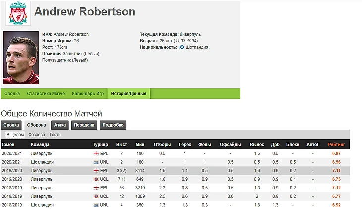 Рейтинг Робертсона возрос на 2 пункта. В частности выросли показатели паса (+3), дриблинга (+1), защиты и физики (также +1). Упала скорость Энди на 2 пункта. Новоиспеченный чемпион Англии в прошлом сезоне Премьер-лиги отдал 12 результативных передач (в сезоне 18/19 был аналогичный показатель). Апгрейд паса объясним: два сезона подряд отдавать 12 ассистов - это фантастический показатель для крайнего защитника. Вообще показатель паса Энди должен быть увеличен как минимум ещё на три пункта. По голевым показателям всё ясно. Давайте взглянем на защитные показатели по сезонами 18/19 и 19/20.