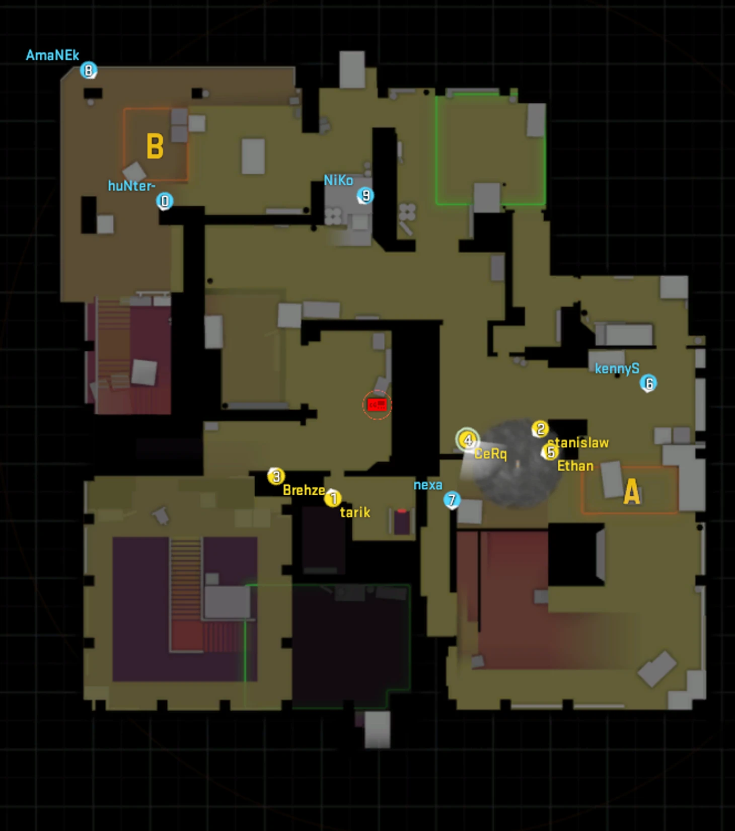 CeRq, Ethan и stanislaw пытаются шуметь на рампе (кстати, как можно видеть. у них опять проблема со смоком), tarik ждет поджима на миду, Brehze делает то же самое под лестницами Б плента. Все, команда соперника закончила разбор атаки EG.