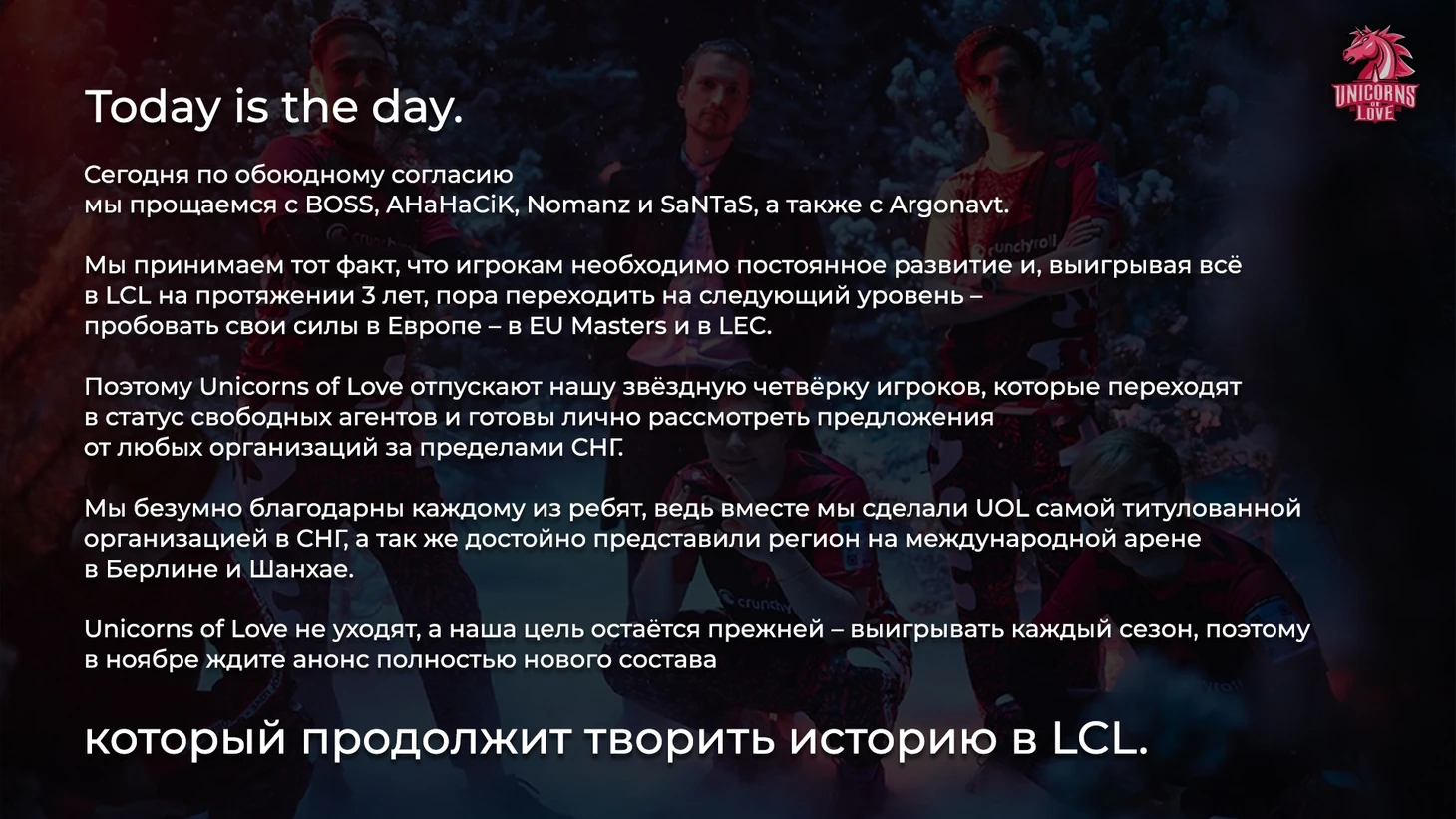 При этом в заявлении ясно написано, что расставание произошло по обоюдному согласию сторон. Иначе говоря, либо ранее были подписаны контракты в случае разрыва трудовых соглашений, если Unicorns Of Love не пройдут в основную часть Чемпионата Мира. Либо будет предоставлена помощь найти ребятам новые команды за пределами СНГ.
