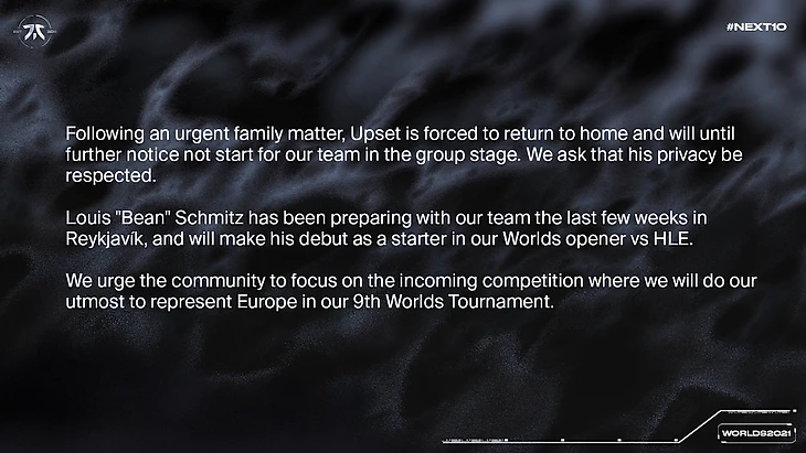 Печальная новость для поклонников Fnatic, стрелок команды по семейным проблемам покидает Чемпионат Мира. Вместо него будет выступать молодой талант академии из Fnatic Rising - Bean.
