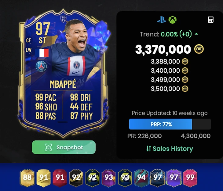 Наконец перехожу к ключевой проблеме игры непосредственно в Ультимейт Тим, хочется честно сказать, что на старте игры, когда она не обременена огромным количеством карточек, в нее действительно хочется играть, игроки не ведут себя как сломанные и не походят друг на друга. К вашему пониманию, количество специальных карточек в фифа 14, 15, 16 к концу игры было гармонично, футболисты имели максимум по 2 разновидности карты, что не требовало от игроков еженедельного гринда для новой цветной карточки, но потом разработчики поняли, что чем больше карт они выпускают, тем больше игроки донатят. ниже представлен скрин из фифы 23 только с одним игроком. 11 КАРТОЧЕК только у одного МБАППЕ, это напрочь ломает всю коллекционную составляющую игры, а самое главное ломает геймплей