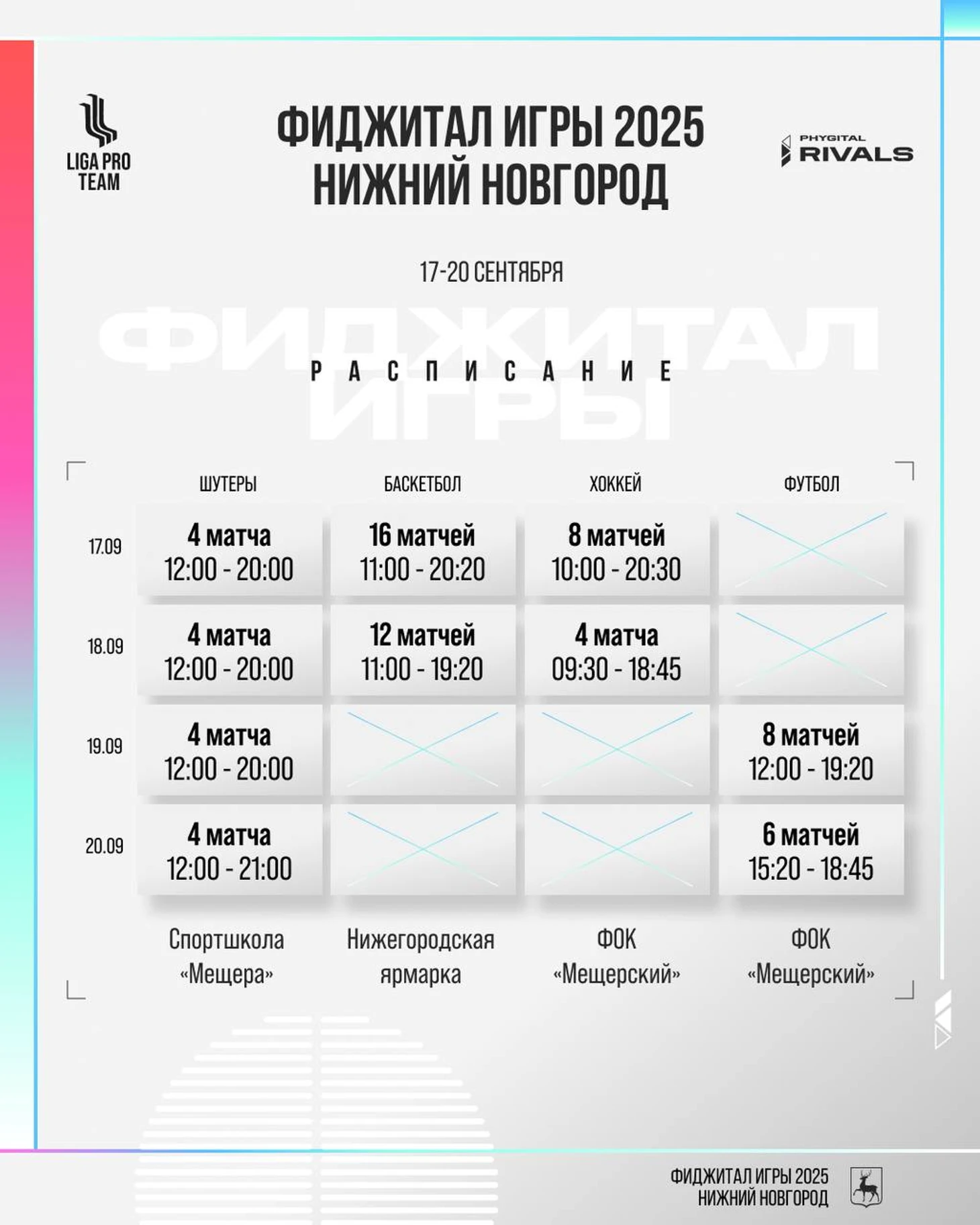 С 17 по 20 сентября Нижний Новгород станет центром притяжения для всего нового спортивного движения. Именно здесь пройдут Фиджитал Игры 2025. Турнир объединит физический спорт и киберспорт, собрав около 400 участников из 56 команд по всей стране. На главных площадках города: Нижегородской ярмарке, ФОК «Мещерский» и спортшколе «Мещера».