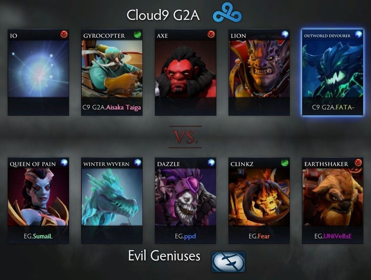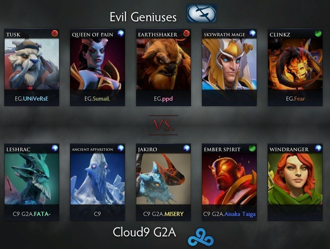 В обеих играх Evil Geniuses брали то, чем играли на протяжении последнего времени — Clinkz был в пике чуть ли не весь ESL One. Dazzle, Earthshaker, Queen of Pain и Tusk — постоянно ротируются в пиках американцев. Cloud9 решили играть с непроверенным для себя пиком — Ember Spirit в этом патче появился в пике C9 в первый раз, Ancient Apparat и Jakiro в предыдущие разы не сильно вписывались в пик команды.