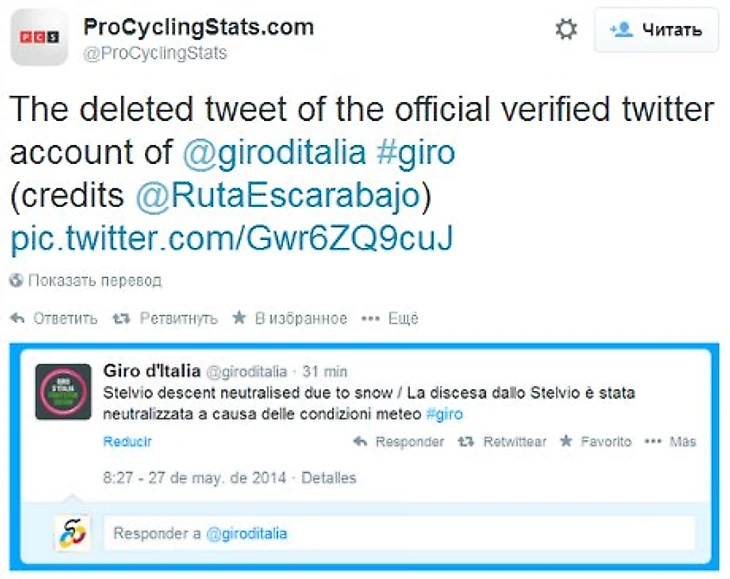 Напомним, что в твиттере организаторов во время гонки появилась информация о нейтрализации спуска со Стельвио из-за плохой погоды, однако затем они удалили запись и извинились за ошибку.