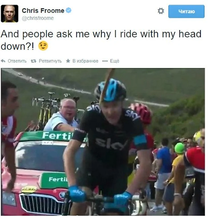 В британского велогонщика Кристофера Фрума во время вчерашнего подъема на Анкарес на «Вуэльте» отлетела палка.