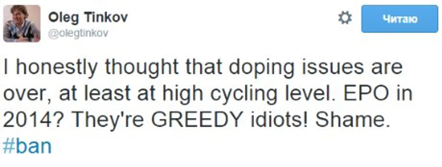 «Я искренне считал, что допинговые проблемы в велоспорте закончились, по крайней мере, на высшем уровне. Использовать эритропоэтин в 2014-м? Они жадные идиоты! Позор. #бан», – написал Тиньков в своем твиттере.