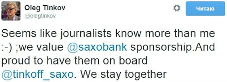«Кажется, некоторые журналисты знают больше меня. Мы ценим спонсорство Saxo Bank и гордимся тем, что он входит в наше руководство. Мы остаемся вместе», – написал Тиньков.