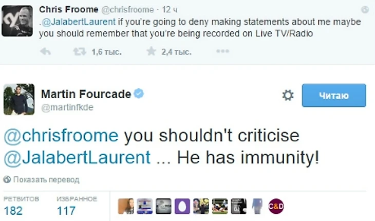 «Крис Фрум, вам не следует критиковать Жалабера. У него есть иммунитет!» – написал Фуркад в твиттере.