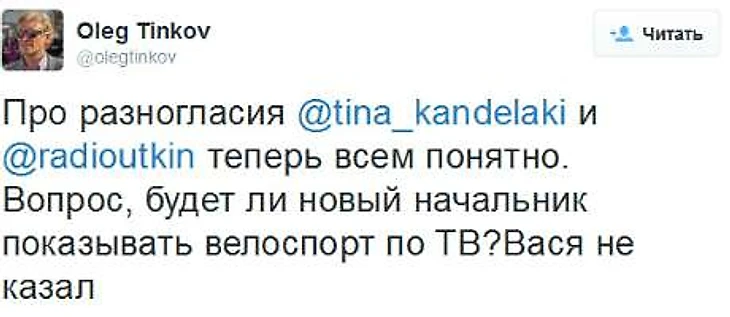 «Про разногласия Тины Канделаки и Василия Уткина теперь всем понятно. Вопрос: будет ли новый начальник показывать велоспорт по ТВ? Вася не сказал», – написал Тиньков.