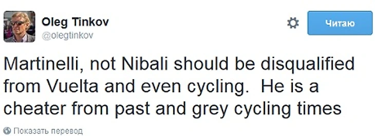 Владелец российской команды Tinkoff-Saxo Олег Тиньков прокомментировал дисквалификацию гонщика «Астаны» Винченцо Нибали на «Вуэльте» за помощь технички.