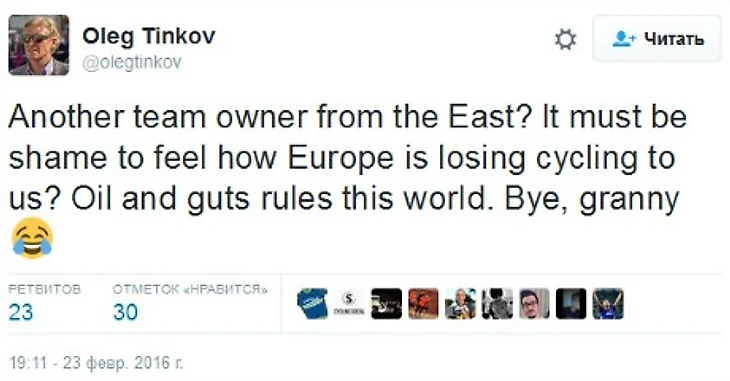 «Еще один владелец команды с Востока? Это должно быть досадно – чувствовать, как Европа уступает нам велоспорт? Нефть и сила воли правят миром. Пока, бабуля», – написал Тиньков.