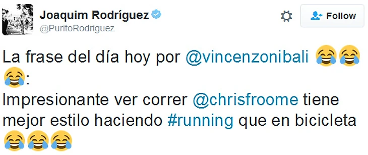 «Цитата дня принадлежит Винченцо Нибали. Он впечатлен тем, что Фрум бегает более стильно, чем едет на велосипеде», – написал Родригес.