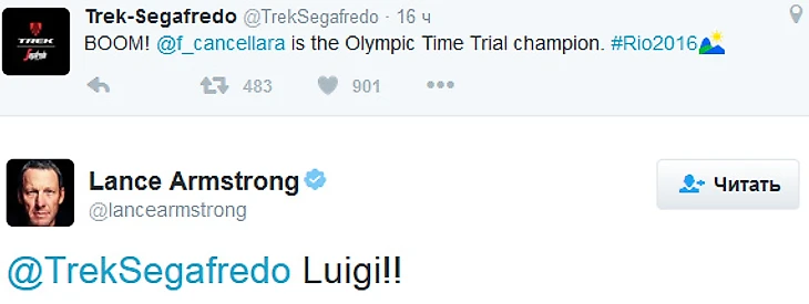 В ответ на поздравительное сообщение команды Trek-Segafredo, за которую выступает швейцарец, Армстронг написал в твиттере: «Луиджи!»