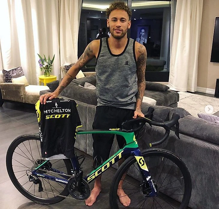 Нападающий сборной Бразилии Неймар, восстанавливающийся после перелома кости стопы, использует для набора формы велосипед, изготовленный для него персонально механиками компании Mitchelton-Scott.