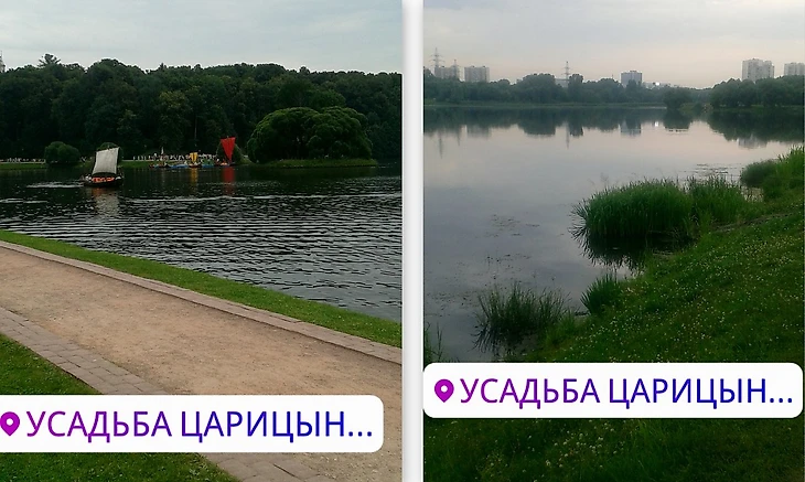 Следующий парк – Царицыно, к нему подъезжаем по Бакинской улице, которая переходит в Липецкую улицу, сворачиваем рядом с футбольным полем. За мою бытность футбольным судьей, это, пожалуй, самое натуральное из всех полей, траву там не сильно коротко стригут или она просто хорошо растет, тяжело бегается. В общем, приехали в Царицыно, по территории парка-усадьбы почему-то запрещено кататься на велосипедах. Совет №3 (он же лайфхак): если очень хочется там покататься на велике, надо заехать не с центрального, а с какого-нибудь из дальних входов, например, со стороны Бирюлевского дендропарка (кстати, тоже шикарный лес, но мы там в этот раз не были). Зайти пешком, с великом в руках, охраннику сказать: «я пешком похожу», - ну и метров через 100 сесть и поехать и так до следующего бдительного охранника, которые обитают у входов/выходов и рядом с дворцами. Ну мы борзеть не стали, велики пристегнули к забору, зашли, перекусили на травке, посмотрели как людей на ладьях катают и поехали между прудов в сторону пересечения Шипиловского проезда и Каширского шоссе и дальше к Братеевскому парку. Вокруг прудов аккуратные ухоженные парки, лошадки травку щиплют. И тут внезапно, Совет №4: если у вас лысая покрышка на заднем колесе, учитывайте это при торможении, особенно не на асфальте, особенно по траве и с горки, велик ведёт в сторону и можно случайно упасть)