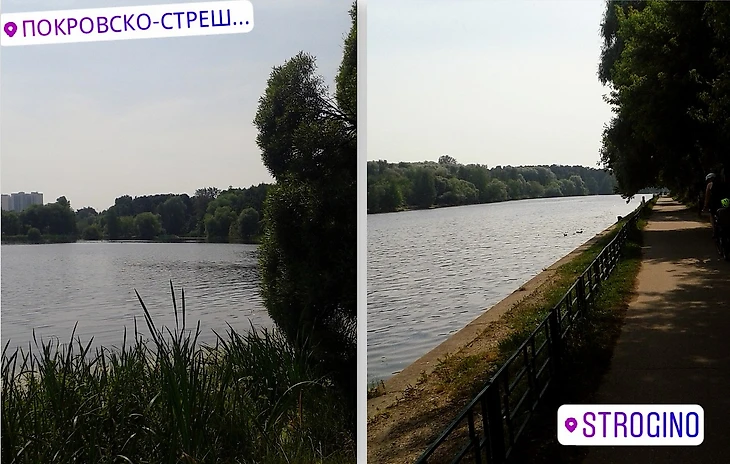 После парка решили через Иваньковское шоссе выехать на набережную канала им. Москвы, долго искали на неё выезд, катаясь по территории какой-то больницы (ЦКБ гражданской авиации). В итоге нашли въезд. Так себе там набережная, потом еще шлюз стоит, который надо объезжать вдоль забора с колючей проволокой. Доехали до Строгинского моста, мимо цветастых домов ЖК Алые паруса, и по мосту двинули в Строгино. Можно было бы поехать по Живописной улице почти до самого гребного канала, но это слишком просто и быстро. Можно со Строгинского моста спуститься вниз и покататься по полуострову между Большим Строгинским затоном и рекой Москвой, но я там уже катался и это не то место, в которое стоит ехать, когда едешь вокруг всего города. Там, конечно, шикарная дикая природа, прям как будто где-то в России, а не в Москве)) Люди купаются, отдыхают, жарят шашлыки, гоняют на катерах. Короче место крутое, однозначно, но в этот раз мы едем мимо. С моста виднеется стадион «Открытие», опять Спартак, но ничего, в этот день мы видели и коней, и бомжей, и мусоров, и паровозы (ну электрички) не раз попадалась. Доехали до Строгино, свернули с моста к пляжу, едем вдоль затона, народу еще больше чем в Тимирязевском парке. Тут тоже песчаный пляж. Ехали, искали глазами душ, не нашли. Дальше по набережной вдоль реки везде асфальт, народу немного, гнать одно удовольствие. Справа лес, слева река, за ней Серебряный бор, дышится легко, даже в 30-градусную жару.